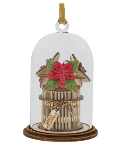 Glazen klokje met een kleurrijke kerstroos en tekst “Merry Christmas”