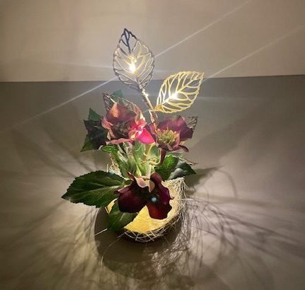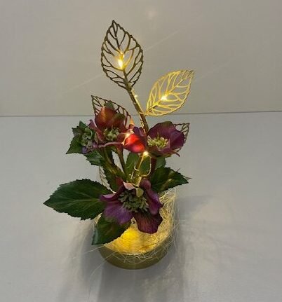 Koperkleurig metaal takje op voet met verlichting en kunststof bloem